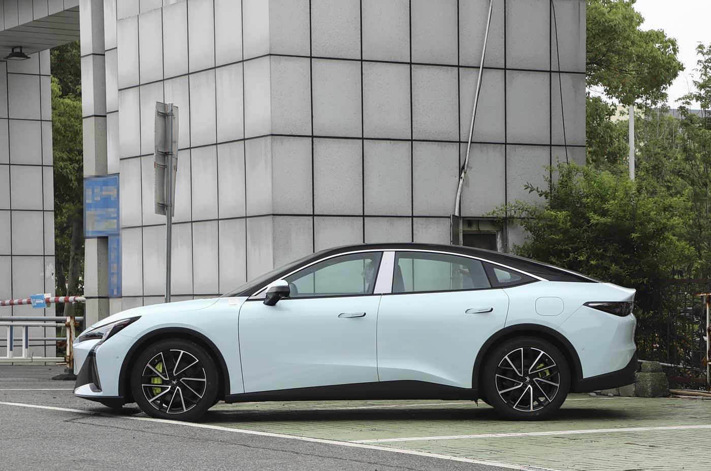 再来看车身侧面部分,4820mm车长搭配溜背式车顶,风阻系数低至0.1925Cd(全球量产车最低),降低风阻可提升续航。隐藏式门把手与无框车门设计延续了极狐家族基因,19英寸米其林PS4轮胎搭配荧光绿卡钳,侧颜辨识度拉满。双色车身选项进一步满足个性化需求,C柱的“北极星”徽标暗藏NFC感应区。