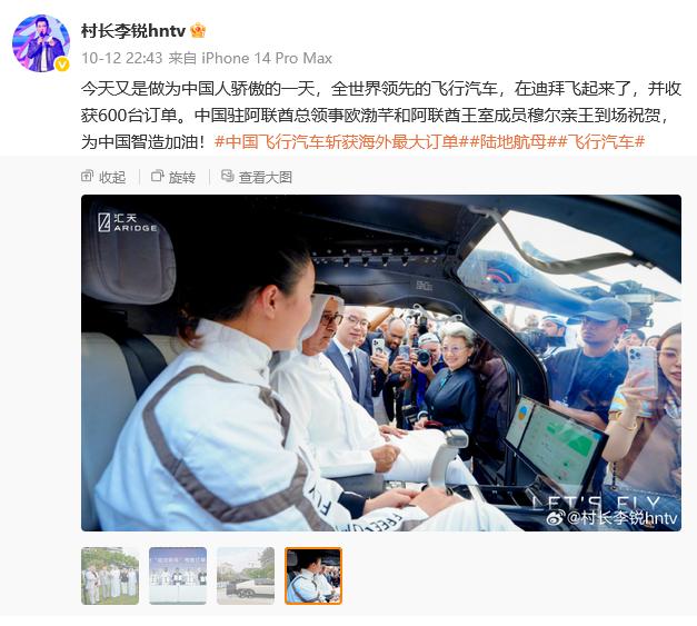 10 月 12 日,湖南卫视主持人李锐发文:今天又是作为中国人骄傲的一天股王配资网站,全世界领先的飞行汽车,在迪拜飞起来了,并收获 600 台订单。